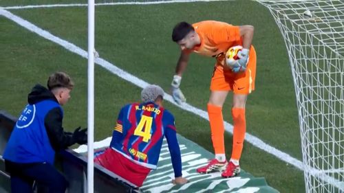 În acel moment, Joan Garcia a intervenit și a prins balonul. Fiind mulțumit de intervenția uruguayanului, portarul Barcelonei s-a dus să-l felicite, în afara terenului, acolo unde se afla Araujo în urma contactului cu Puertas.