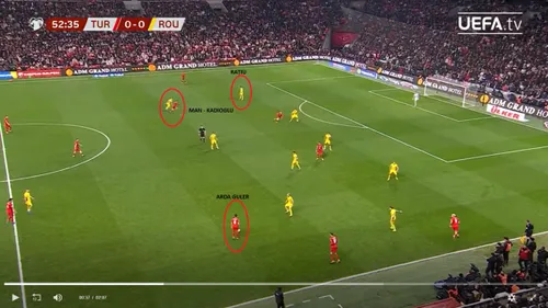 GOLAZO.ro a descompus faza care a decis partida. Turcia se afla într-un atac pozițional, instalată în jumătatea României. Tricolorii aveau 9 jucători de câmp sub linia mingii. Singurul rămas avansat era Bîrligea.