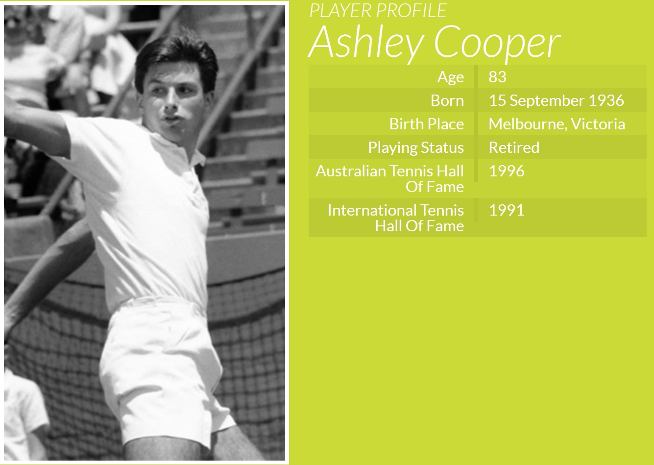 A fost lider mondial în 1957 și a reușit să se impună în carieră la Australian Open, Wimbledon și US Open. Este unul dintre cei mai apreciați jucători de tenis pe care i-a dat Australia. Ashley Cooper a murit la 83 de ani, lăsând în urmă pagini memorabile în istoria sportului alb.