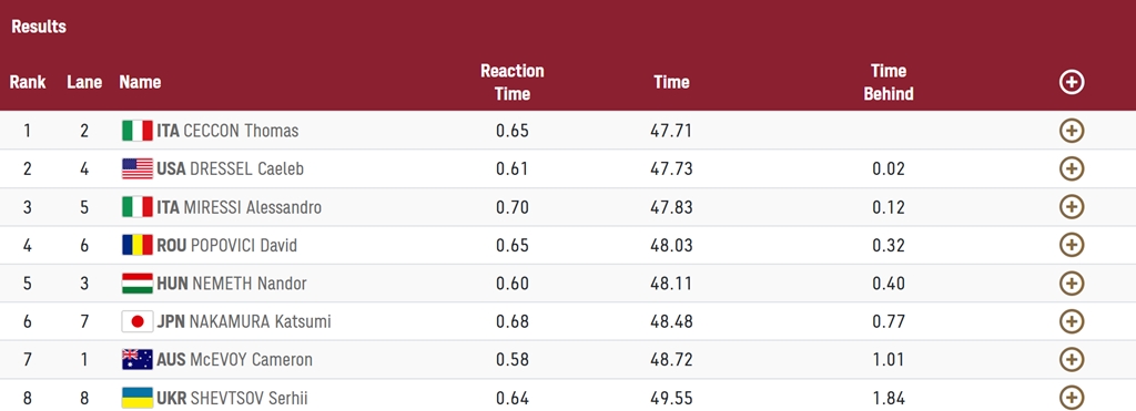 Seria a fost câştigată de italianul Thomas Ceccon, cu 47.71, urmat de americanul Caeleb Dressel, 47.73, și de un alt italian, Alessandro Miressi, 47.83.